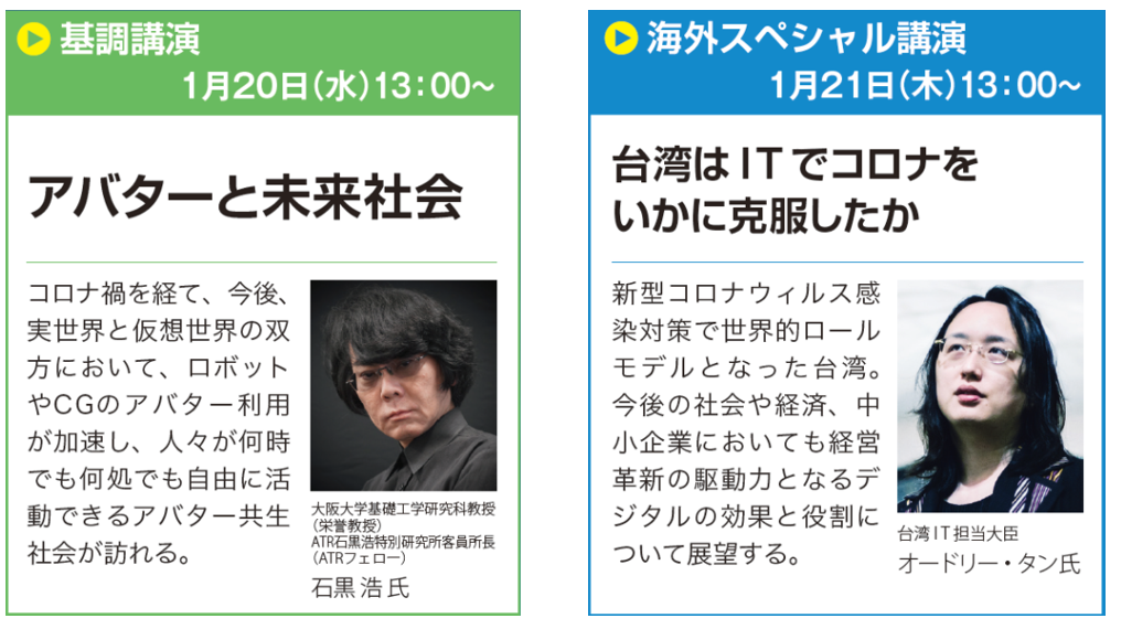 リアルなイベント空間さながらのステージにて、大阪大学基礎工学研究科教授(栄誉教授)石黒浩氏の基調講演や台湾IT担当大臣のオードリー・タン氏に加え、ヴァーチャル産業交流展にふさわしい「ニューノーマル」や「DX」などのテーマに沿ってビジネスキーパーソンや、企業のトップによる豪華な登壇者による講演をオンラインにて公開します。