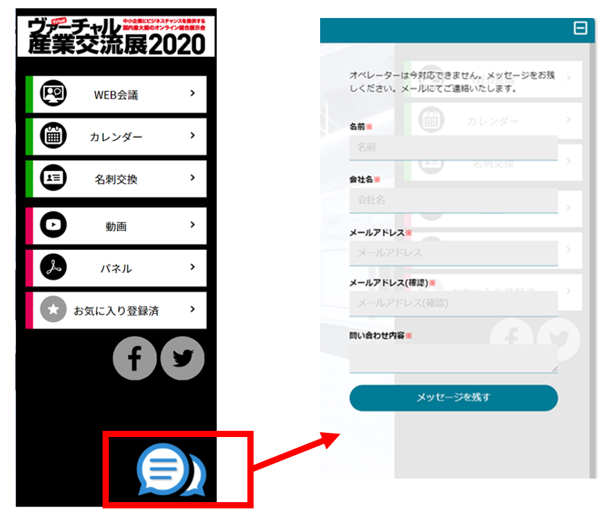 出展者とリアルタイムでコミュニケーションがとれるテキストチャット機能を搭載。出展者へ気軽に問い合わせをすることができ、商談を行うことも可能です。
