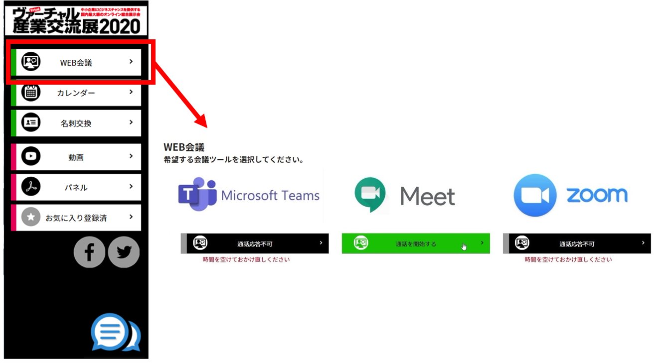 その場で出展者とウェブ会議を実施することが可能。日常業務で利用しているウェブ会議ツール(Microsoft Teams、Meet、zoom)の中から好きなものを活用できます。